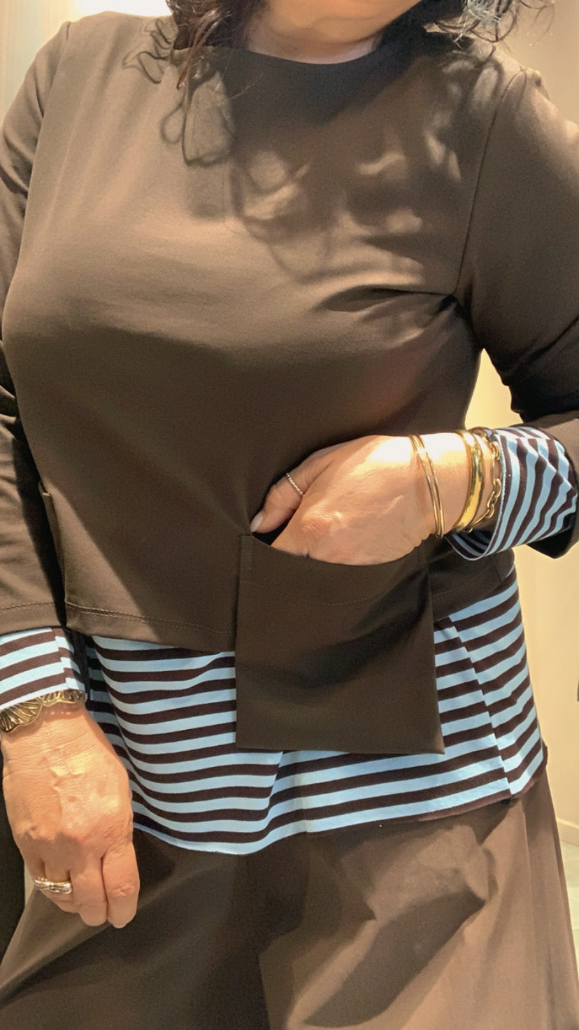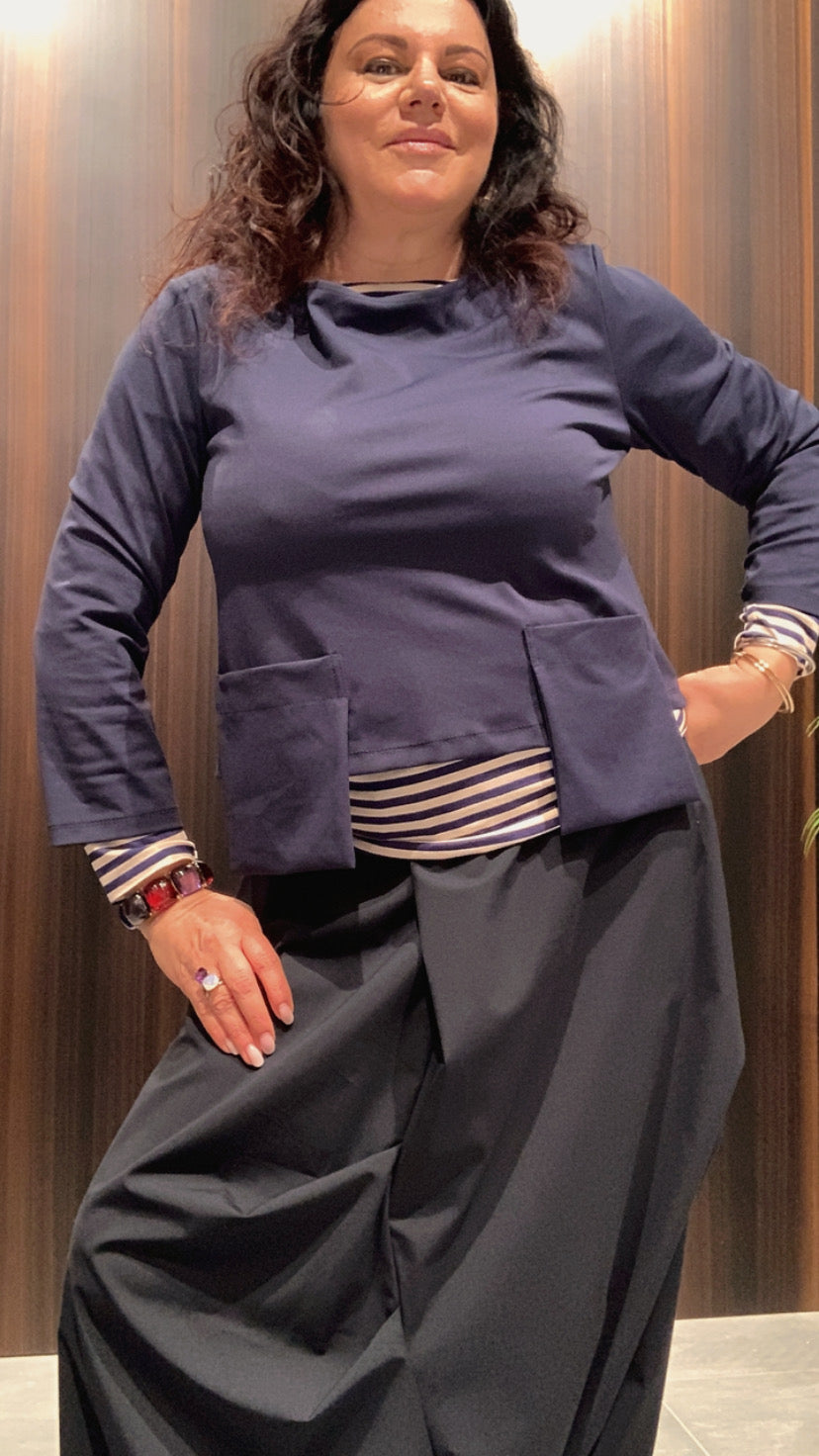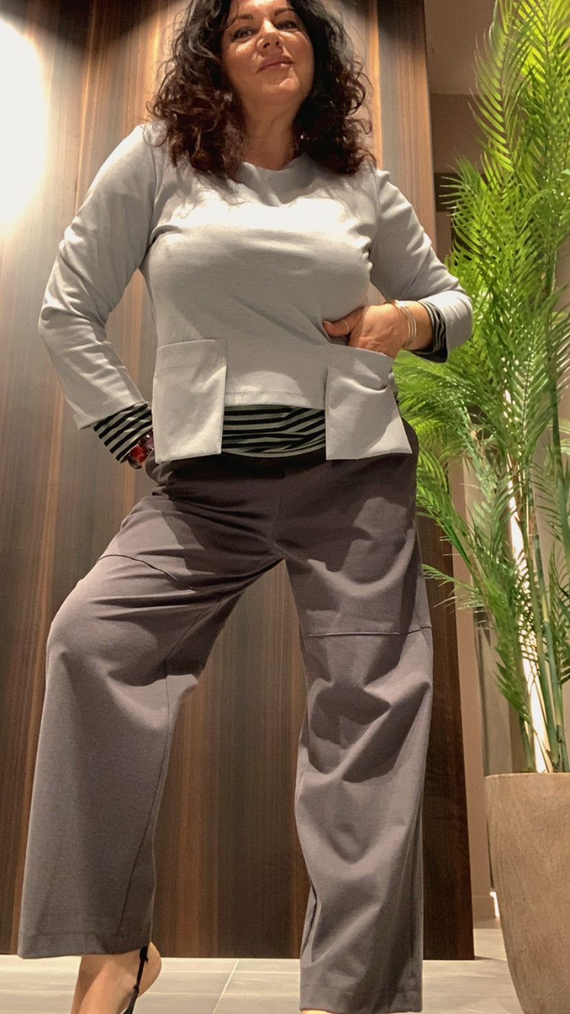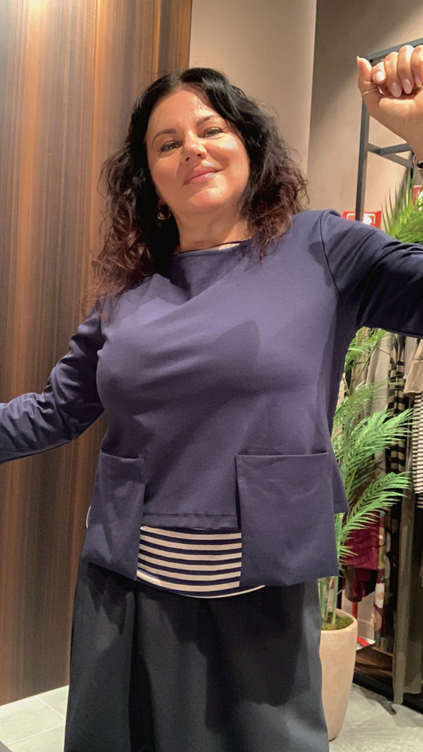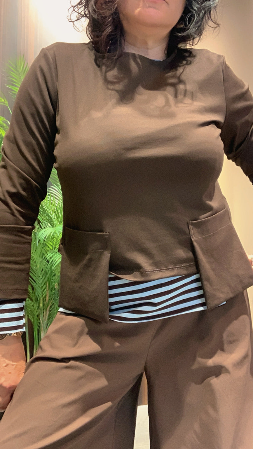 Maglia in tessuto elasticizzato punto milano ,girocollo ,cropped,con taschine davanti