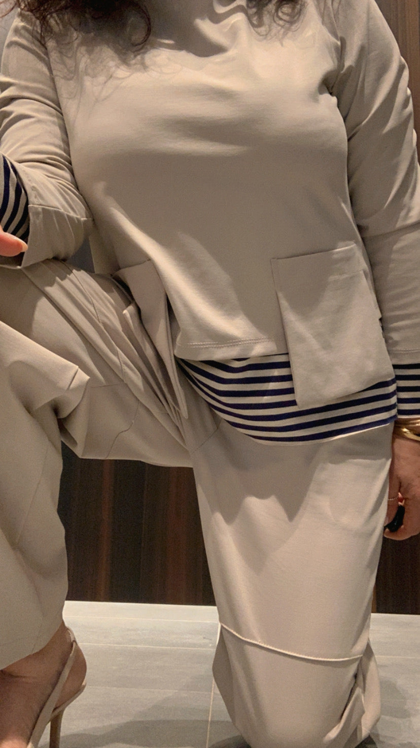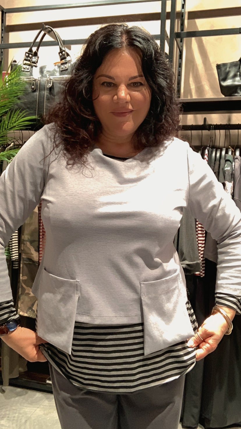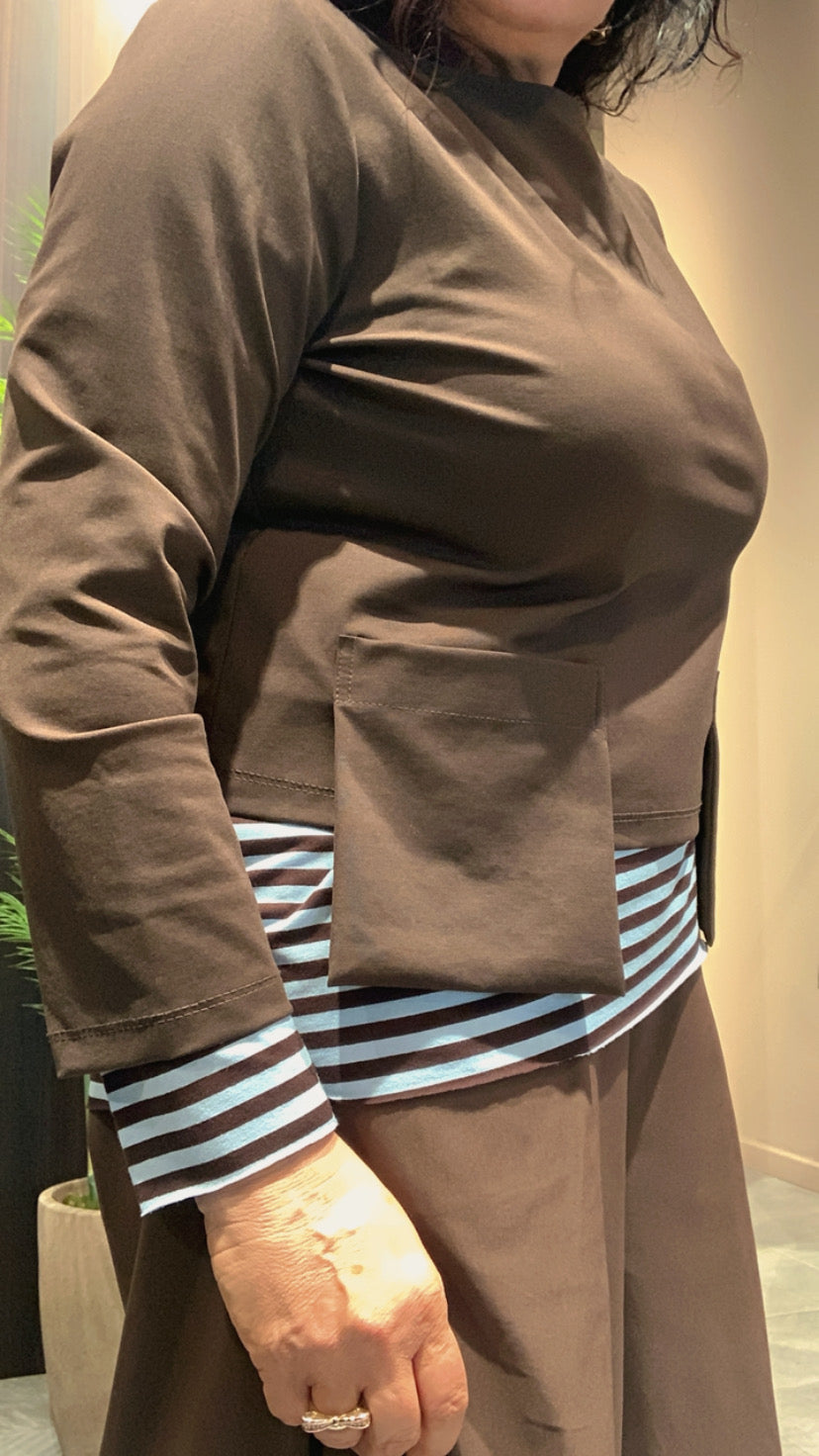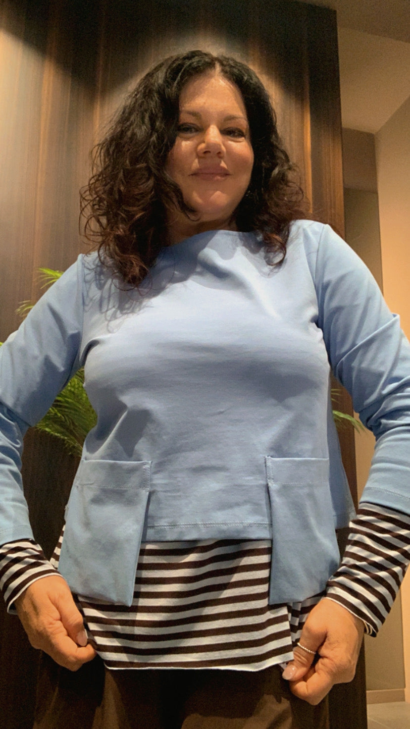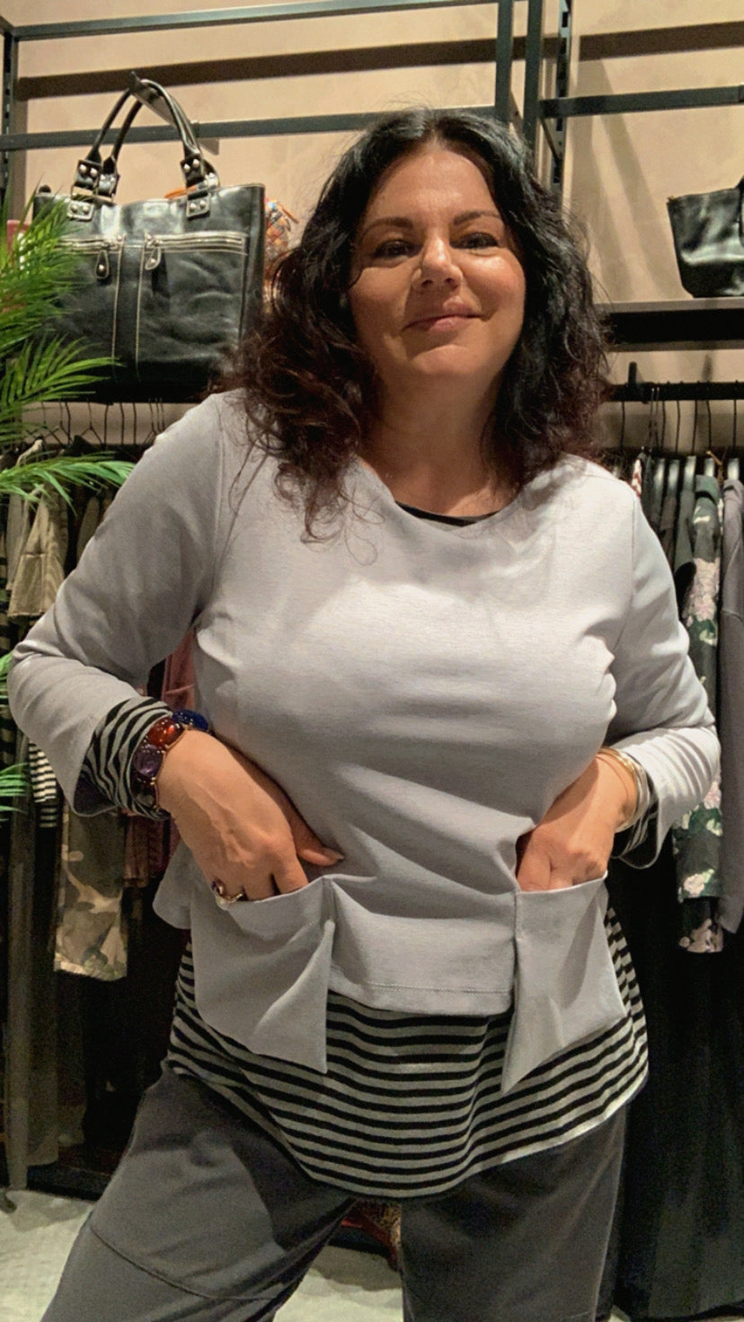 Maglia in tessuto elasticizzato punto milano ,girocollo ,cropped,con taschine davanti