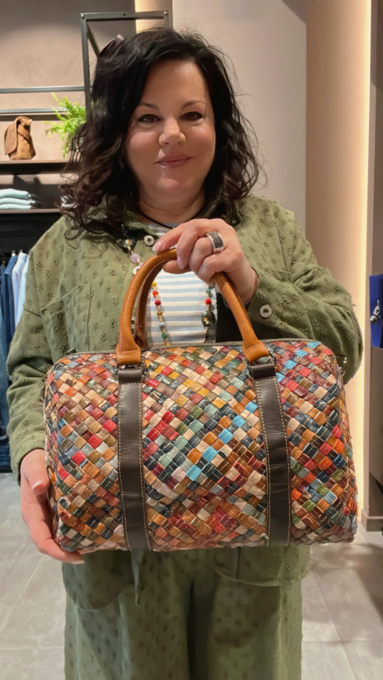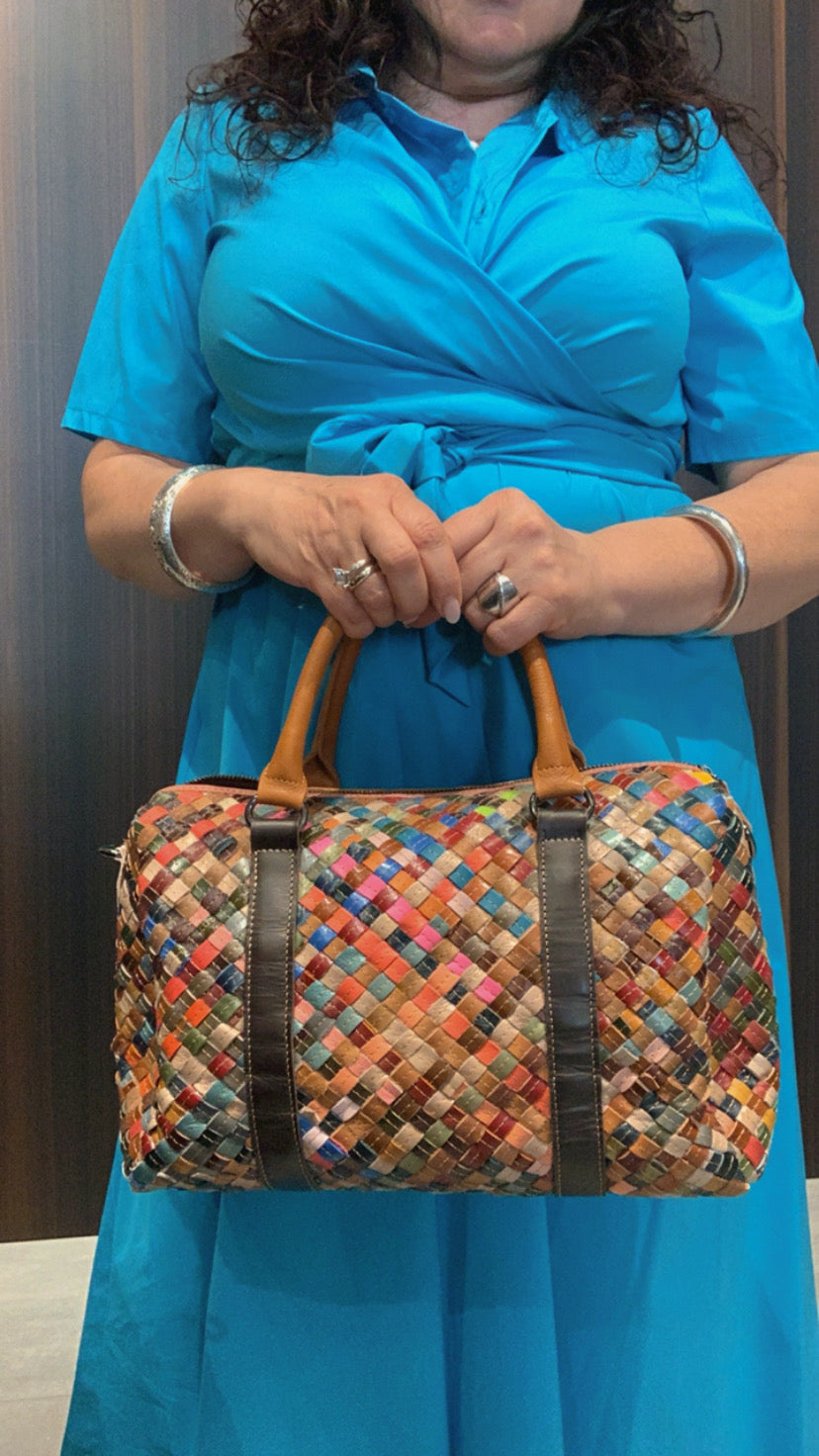 Borsa bauletto in pelle intrecciata multicolore, uno scomparto , chiusura zip.Vera pelle.Dimensioni L 330mm P 120 mm H 200 mm.